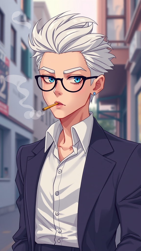A cartoon-like illustration of a suave, retro anime-inspired person with striking white hair, smoking casually. Featuring sharp, gentle eyes and wearing a tailored suit, this character exudes a serene yet confident demeanor. The artwork is infused with bright pastel colors, lending a dreamlike quality to the scene. The composition takes inspiration from digital artists Yanjun Cheng, Beeple, Rhads, and Lois van Baarle, resulting in a piece that blends digital artistry with a retro anime aesthetic, capturing both modernity and nostalgia. The character stands amidst a softly blurred urban backdrop, adding depth and context to the serene yet intriguing image.