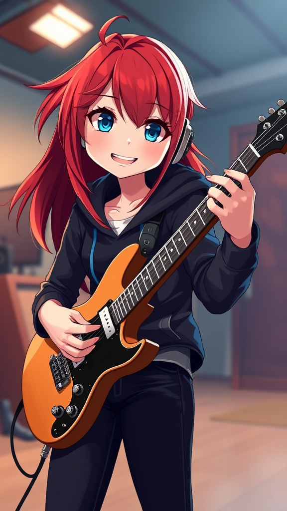 A cartoonish anime-inspired image of a redhead girl with long hair styled to one side, flirtatiously smiling at the camera. The scene features her in a dynamic angle, full body cowboy shot, playing a guitar. She's wearing black pants and a hoodie, with her striking blue eyes accentuated by dramatic lighting and high contrast. The image captures intricate details, with her red lips adding a pop of color to her Asian-inspired features. She's holding a plectrum in one hand and has headphones. The background is slightly blurry to emphasize her hyper-detailed presence in the foreground.