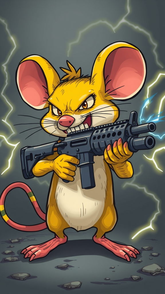 A cartoonish, electric yellow mouse sporting a fierce expression and clutching a comically oversized assault rifle, exuding a sense of whimsical ferocity while surrounded by crackling sparks of electricity.