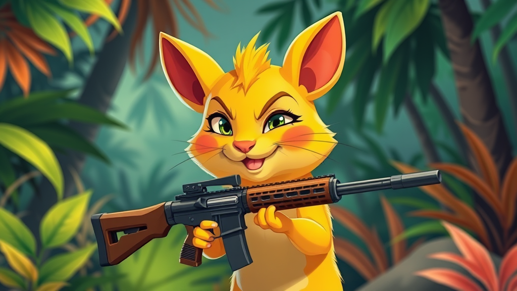 A cartoonish yellow creature with pointy ears and red cheeks, resembling a beloved electric rodent, playfully holds a toy rifle with a mischievous gleam in its eyes, set against a vibrant jungle backdrop.