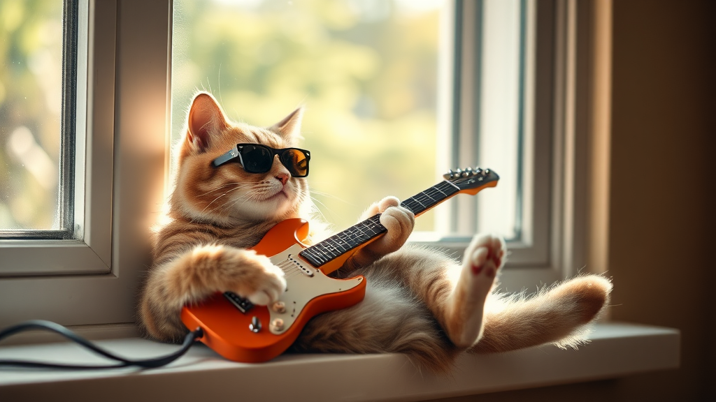 A cat in sunglasses strumming a miniature electric guitar, lazily lounging on a sunlit windowsill while its tail taps rhythmically to a classic rock tune.