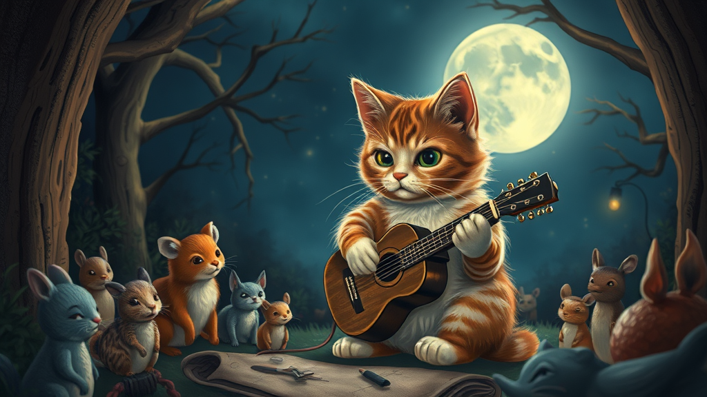 A cat strumming a miniature guitar under the moonlit night, surrounded by an audience of curious woodland creatures.