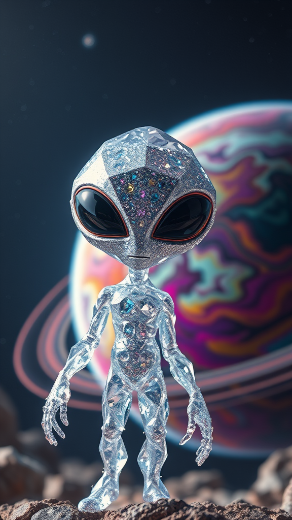 A celestial being made of shimmering crystals, its form glistening under distant starlight, with two large, glossy black eyes that seem to hold the depths of the universe. The alien stands against a backdrop of a vibrant, otherworldly planet, its surface swirling with colorful gases and rings that gleam like cosmic jewels. The scene unfolds in a vertical orientation, capturing the ethereal beauty and mystique of this interstellar setting.