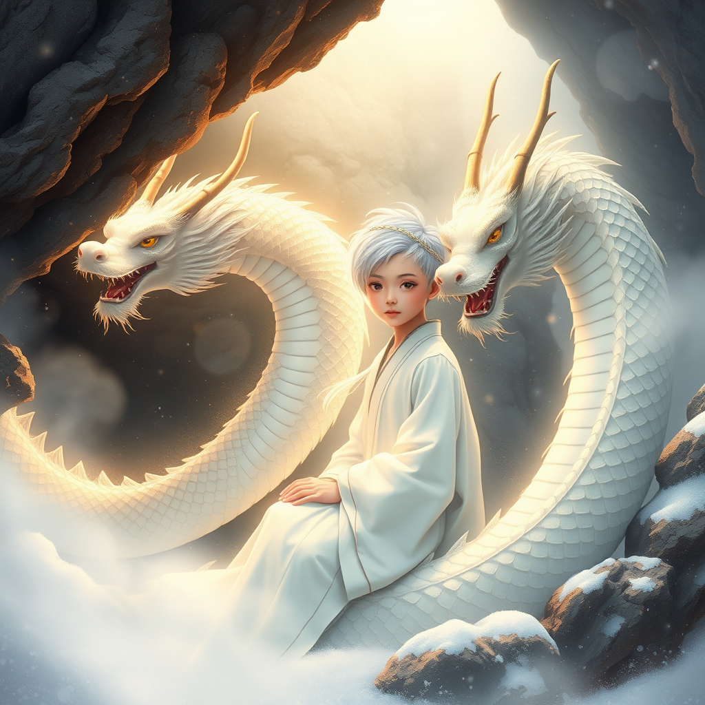 A celestial Chinese boy with shimmering white hair resides in a mystical cave, his presence ethereal and serene. Dressed in a flowing white Daofu, he embodies elegance and tranquility. A delicate headband crowns his head, symbolizing his spiritual connection. Beside him, a majestic Chinese dragon coils gracefully, its scales glistening like precious jewels. The scenery unfolds like a vivid Japanese Ukiyo-e painting, capturing the enchanting essence of a Chinese fairy tale. Mist shrouds the landscape, and white snow gently blankets the ground, creating a dreamlike atmosphere. Graceful figures move like whispers in the wind, enhancing the magical ambiance of this serene tableau.