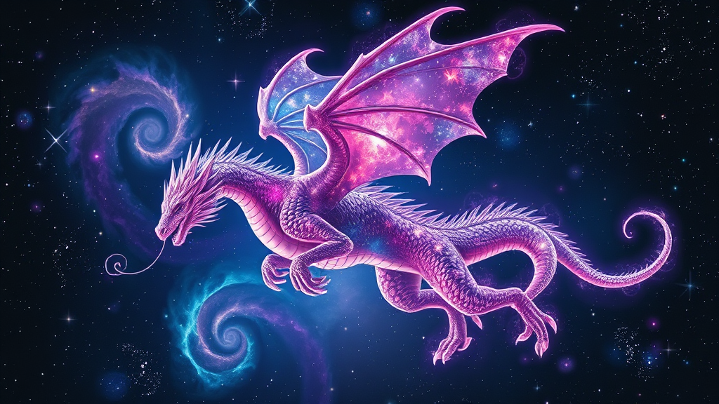 A celestial dragon made of colorful cosmic nebulae soaring through a starry night sky, its scales shimmering with hues of purple, blue, and pink, surrounded by swirling galaxies and twinkling stars, with long, ethereal whiskers trailing behind, in the style of a surrealist dreamscape, ultra-realistic, high-definition, intricate detail, with vibrant, glowing energy illuminating the scene.