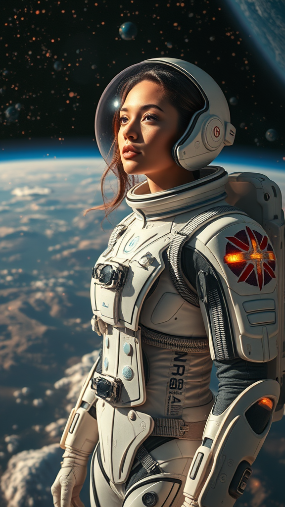 A celestial female figure in a heavenly realm, adorned in a futuristic spacesuit, surrounded by intricate satellite imagery; she gazes down from above. The scene, captured in epic photography, is illuminated with natural and golden cinematic light, exuding photorealism. Her presence is accentuated by the finest details, crafted in 8K Ultra-HD quality. The atmosphere merges ethereal beauty with advanced technology, depicted in an awe-inspiring, epic setting where every small detail adds to the grandeur of the moment.