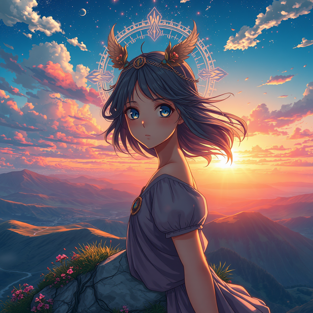 A celestial girl poised on a hilltop, centered in the scene, showcasing a beautifully detailed and captivating face in anime style, evoking a key visual with intricate and highly detailed features. The breathtaking and vibrant panorama unfolds in a cinematic landscape, drawing inspiration from the works of Carne Griffiths and Conrad Roset, with a touch of Ghibli magic.