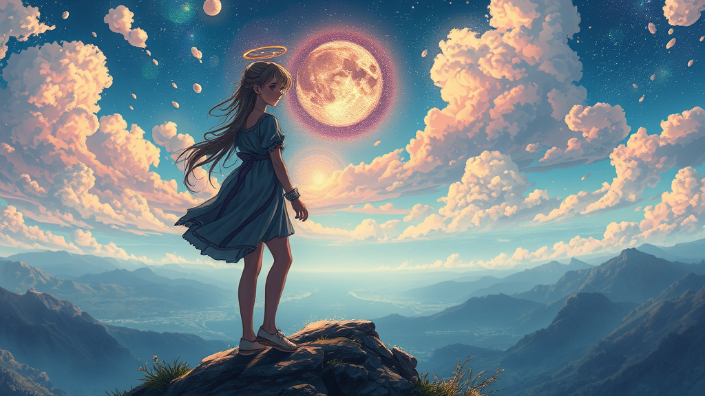 A celestial girl standing gracefully atop a hill, perfectly centered with an exquisitely detailed and stunning face inspired by anime aesthetics, the scene captures a key visual with intricate and breathtaking artistry. The panoramic view is vibrant and cinematic, reminiscent of Carne Griffiths' and Conrad Roset's styles with a touch of Ghibli magic, offering a richly detailed and awe-inspiring sight.
