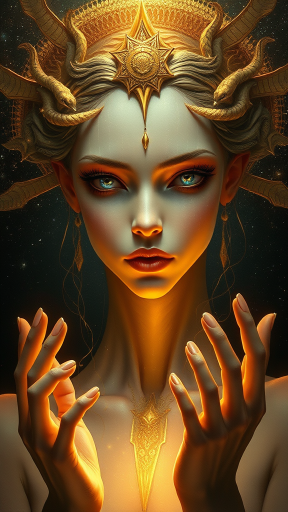 A celestial goddess in the style of Boris Vallejo, featuring a hyper-detailed, realistic face with dramatic illumination. The scene is dark and cinematic, captured in 16k UHD HDR. The goddess possesses an ethereal beauty with a long neck and intricate details. Her eyes have a unique, enigmatic quality. The background glistens with a cosmic allure, enveloping her in celestial ambiance. She gracefully extends her hands, adorned with elegant fingers that almost seem to flow with mystic energy. Her visage exudes power and tranquility, embodying the essence of the heavens. Despite her divine perfection, there's an intriguing asymmetry that adds depth to her otherworldly charm.