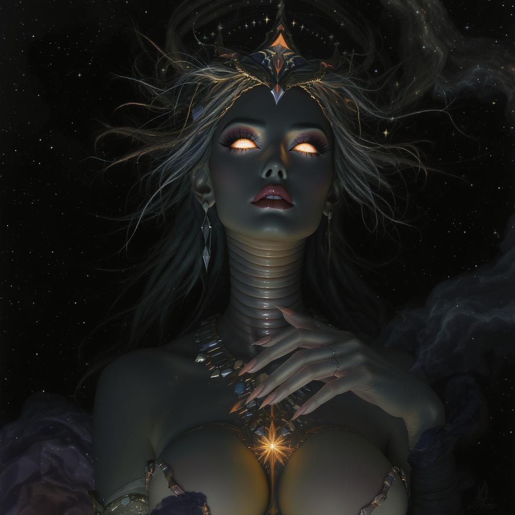 A celestial goddess in the style of Boris Vallejo, featuring a hyper-detailed and hyper-realistic face with dramatic illumination, set in a dark cinematic atmosphere. Her eyes possess a unique and mystical distortion, adding an otherworldly charm. Her hands, adorned with extra fingers, create an intriguing and unusual appearance. The artwork showcases a high level of detail with UHD and HDR quality, capturing the ethereal essence of the goddess. Despite this, there are artistic quirks present: a sense of uncanny beauty with a long neck and unusual eye alignment. The image, reminiscent of a dreamlike reference sheet, stretches the boundaries of reality, exploring the effects of artistic imperfection while maintaining its celestial core.