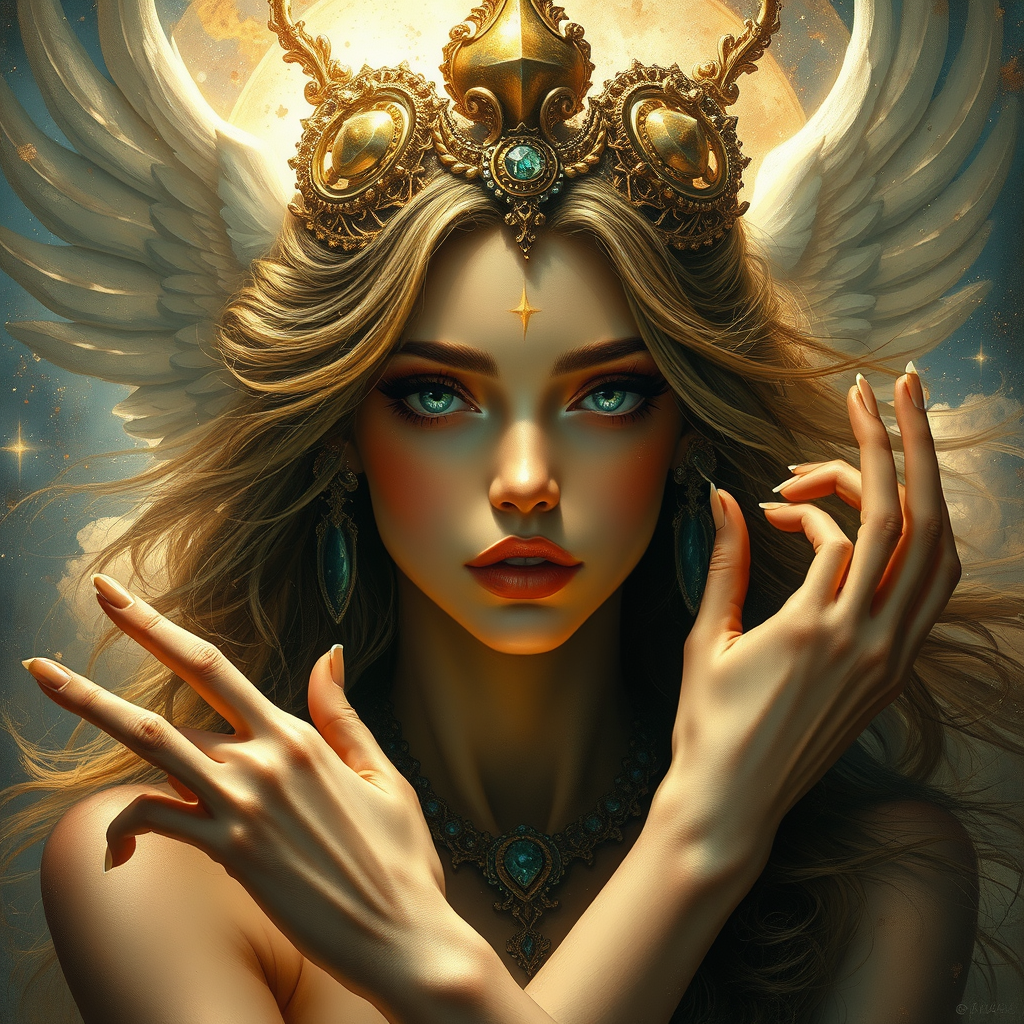A celestial goddess painted in the style of Boris Vallejo, embodying hyper realism and intricate details, particularly in her face with a touch of dark cinematic allure and dramatic illumination. The goddess stands out with an ethereal presence, her features perfectly crafted to hint at a blend of mystique and grandeur. Her eyes, uniquely captivating, possess a dreamlike quality that defies conventional symmetry. She holds an otherworldly grace with subtly surreal elements, like elongated fingers that dance gracefully through space. The atmosphere around her shimmers in UHD, filled with HDR depth, enhancing the goddess's divine appearance. The scene captures her essence without distractions, focusing on the beauty of the fantastical and celestial.