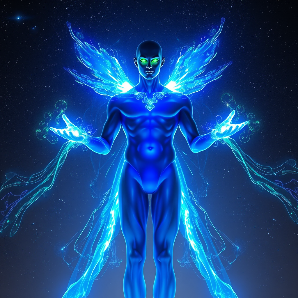 A celestial humanoid male stands majestically against a vast expanse of stars, his ethereal form infused with a radiant blue aura that pulsates gently. His eyes, glowing an enigmatic emerald green, captivate with their piercing intensity. The cosmic void behind him serves as a perfect canvas for the vibrant spectacle he embodies. From his outstretched hands, beams of brilliant blue and green light cascade, flowing gracefully like liquid energy. His presence exudes an otherworldly power, as swirling nebulae of light flicker and dance across his form. Illuminated by cinematic lighting reminiscent of Unreal Engine's magic, this cosmic being defies earthly limitations, a mesmerizing fusion of light and mystique.