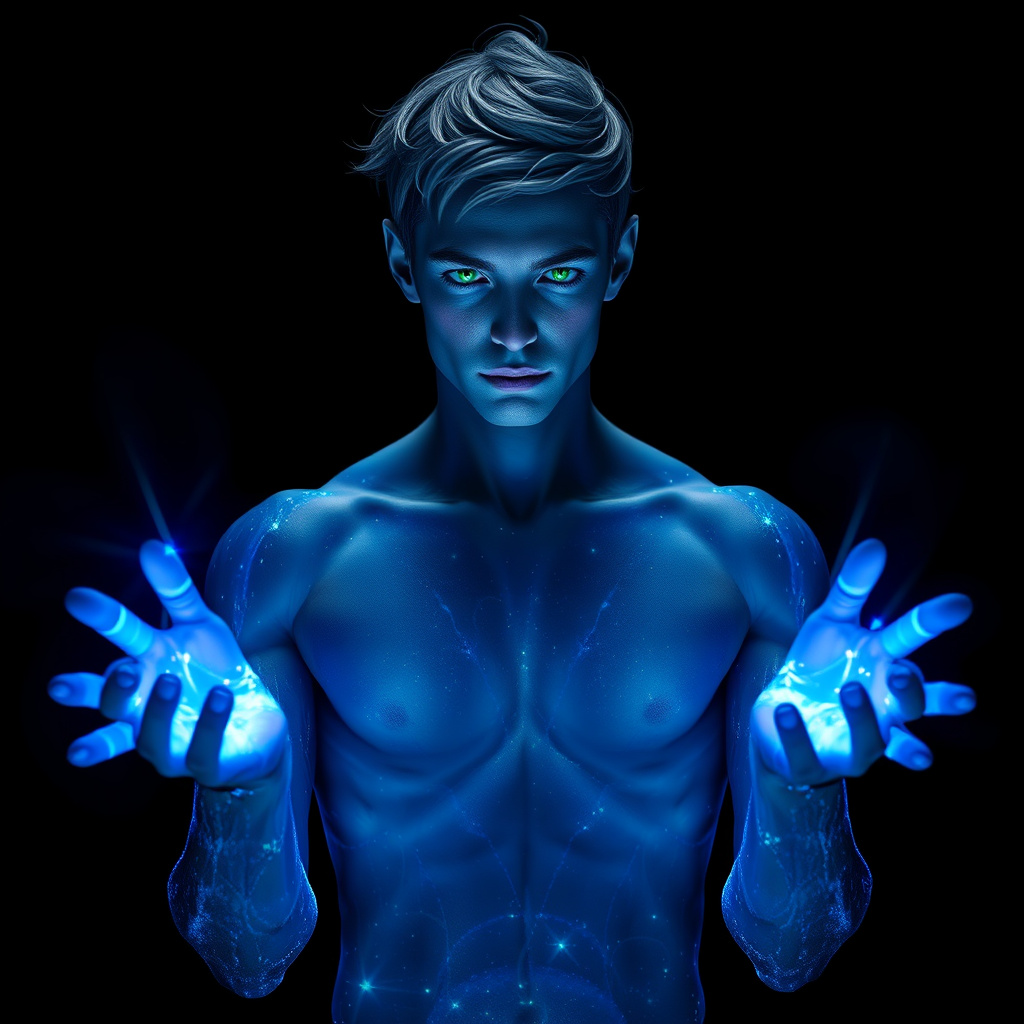 A celestial humanoid male with a radiant blue aura and piercing green eyes stands against a black backdrop. Blue and green light emanates from his open hands, casting dynamic shadows on his ethereal form. His entire body shimmers with an otherworldly luminescence, creating a captivating contrast with the darkness that envelops him. The scene is captured in Unreal Engine 4, utilizing cinematic lighting to highlight the intricate details of his celestial features and the mesmerizing interplay of colors.