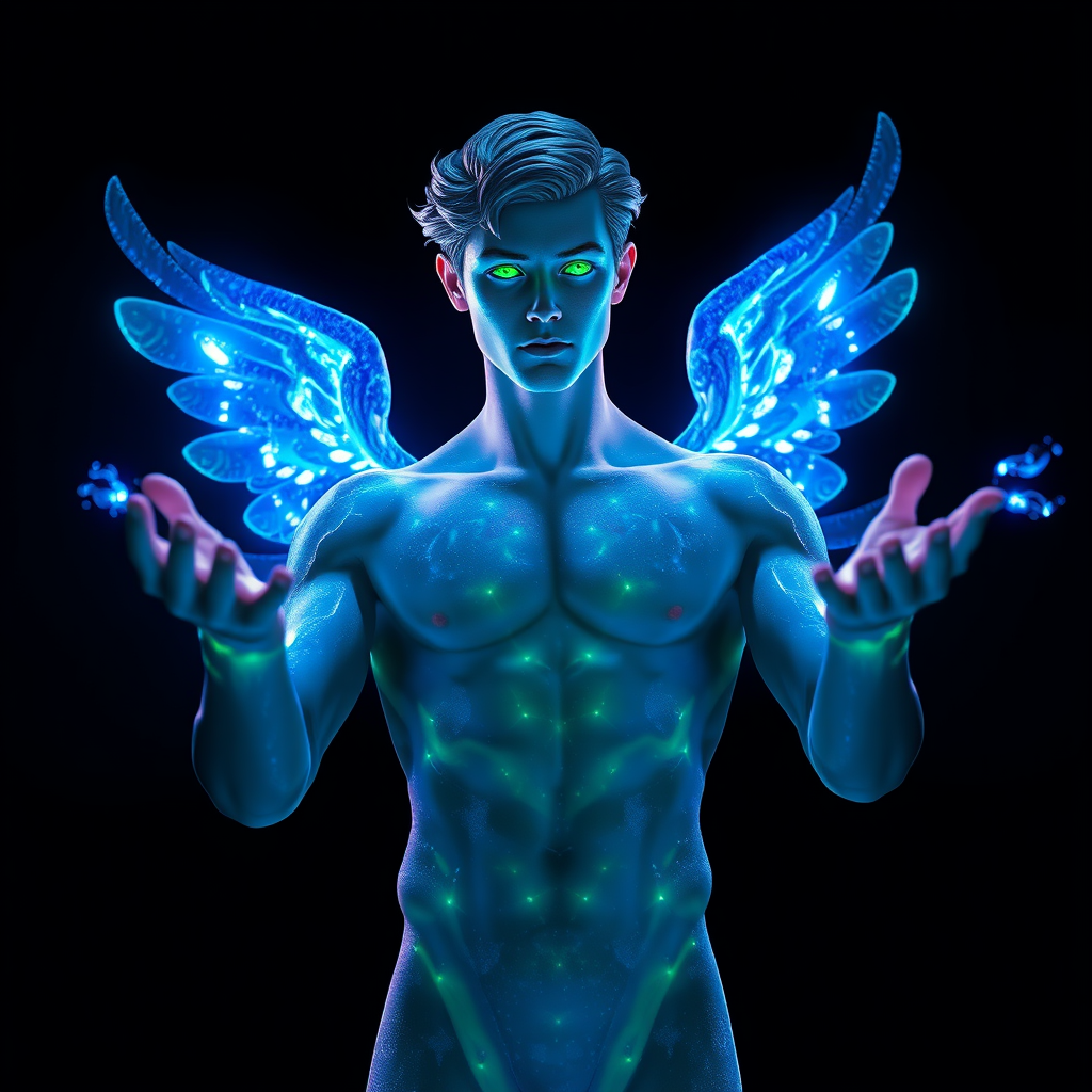 A celestial humanoid male with a shimmering blue aura and vibrant green eyes stands against a deep black backdrop. His figure exudes an ethereal glow as brilliant blue and emerald light emanate from his outstretched hands, casting dynamic illuminations on his form. Rendered in Unreal Engine 4, the scene is captured with cinematic lighting that highlights the intricate details of his features and the mesmerizing interplay of colors, giving the entire composition an otherworldly, mystical quality.