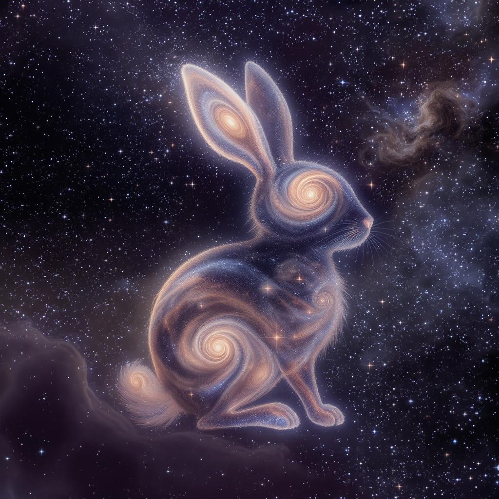 A celestial scene of galaxies and spirals forming the delicate shape of a rabbit, set against the vast expanse of space. Nebulae and stars create an ethereal backdrop, with iridescent hues and smoke-like wisps adding depth. The scene is rendered with intricate detail, achieving a radiant, high-resolution beauty reminiscent of an 8k octane render, capturing the mystique and grandeur of the cosmos.