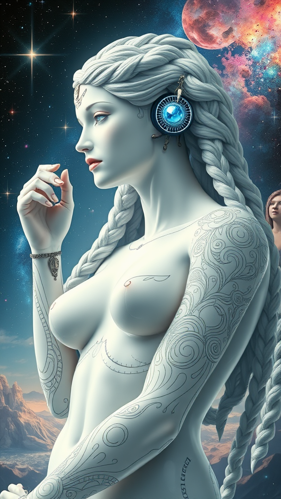 A celestial vision of the Birth of Venus, featuring an ethereal android with pure white glossy translucent skin reminiscent of Egyptian Arab beauty, adorned with intricate tribal QR code digital tattoos and gleaming cybernetic augments. Set against a cosmic sea of stars and vibrant nebulae, this Botticelli-inspired creation captures the essence of a humanoid robot with mesmerizing blue crystal eyes and elegantly braided hair. The scene evokes a fusion of classical art and futuristic allure, enveloping the viewer in a transcendent realm where tradition meets innovation.