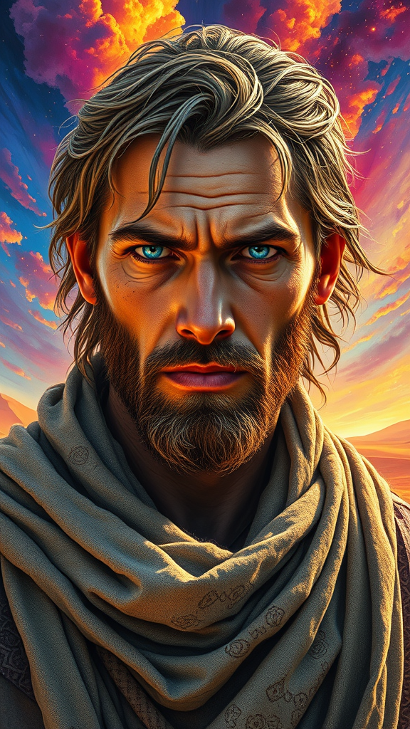 A central portrait of a rugged male Dune character with striking blue eyes and weathered skin, showing a hint of stern determination. Clad in tattered desert attire, the fabric appears to ripple with invisible desert breezes. The background is infused with a vivid array of psychedelic hues, creating a fantastical, ever-changing sky. Intricate patterns adorn his garments, while shimmering sand particles cling to his skin. Minute reflections in his eyes enhance the painting's impact. The scene exudes a surreal, dreamlike mood, capturing the Dune universe's mysterious essence. An atmosphere of quiet strength and tension echoes the character's journey. The painting draws inspiration from Conrad Roset, Greg Rutkowski, and Makoto Shinkai, blending Roset's vibrant colors and fluid lines, Rutkowski's expert lighting and detail, and Shinkai's epic scope and drama to encapsulate the character's essence in a uniquely beautiful, surreal style.