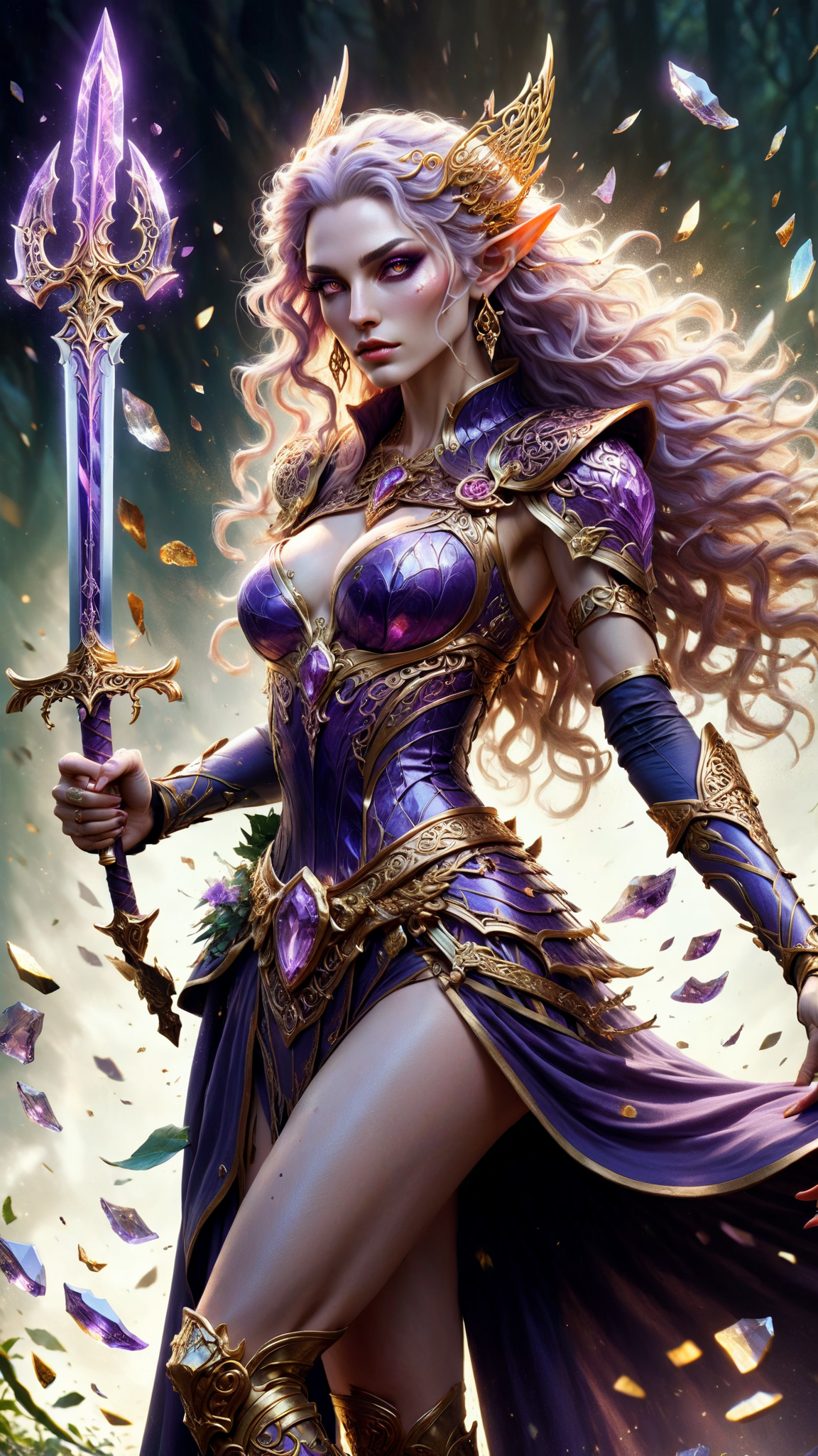 A character for Changeling: The Dreaming. A Sidhe/Elf, Fae, warrior, member of The Crystal Circle. Irish Celtic. Part dream, part real, ethereal, magical. Feminine female, young woman. Tall, athletic, strong, beautiful, modelesque. Her hair is a very pale Violet, long layered curls, side parted and swept back on one side, fluffy curls falling over one eye. Beautiful amethyst eyes with long lashes. She wears a gold metal tiara with amethyst crystals on her head. Elvish ears with gold and amethyst spear earrings. Gold metal pauldrons on her shoulders, a gold metal chestplate armor with a Celtic lion motiff, signifying the royal house she belongs to. A long sleeved form-fitting Violet top under her armor, gold bracers with Celtic motiff on her arms. A gold metal belt around her waist, a triskelle symbol at the center. A Violet tiered frilly knee-length dress with amethyst crystal accents. Metallic gold boots with shin-guards and heels. A long Violet cape with bright yellow-gold Celtic trim designs overlaid around the edges, held by a cloak pin. Sidhe are radiant beings, so she shines like the sun and sparkles gold glitter. Her magic is multi-colored rainbow sparks. If that doesn't work, she carries a golden longsword with a serrated double-edged blade, as all elves carry swords. Full body pose, standing within a crystal circle holding her sword and performing magic. Various sprites are flying around her.