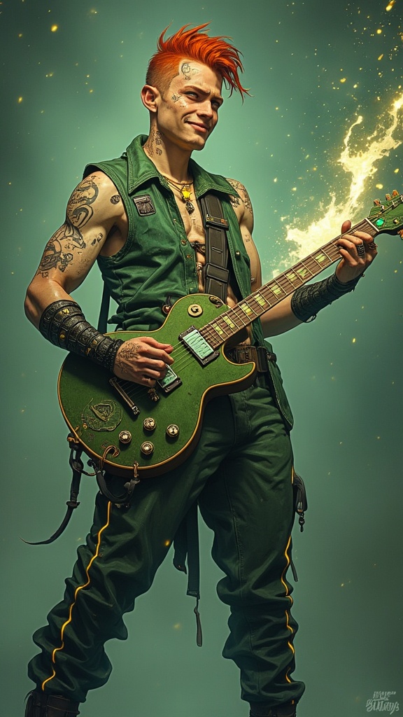 A character for Changeling: The Dreaming. Fairy tales in modern times. This character is is Clurichaun, very similar to a Leprechaun, a male faery-being. He is a talented Rock musician, he sings and plays electric guitar. Unbeknownst to most people, he infuses a little magic into his music. What people think are special effects is him using his abilities. He sparkles and shines on-stage, surrounded by glittering stars. His voice can charm angels. And if things get dangerous or uncomfortable, he can disappear in the blink of an eye! Masculine Caucasian young college-aged man of Irish/Celtic heritage. Medium height, thin but muscular, lithe, sinewy. Fair skinned, coppery red hair, emerald green eyes that slightly glow. Thin, handsome rugged face with red soulpatch and freckles across his nose and cheeks. Strong brow and jaw, faux-hawk hairstyle short on sides and back, longer and touseled on top. His ears are slightly pointed, as are most faery beings. He wears a small gold hoop in one of his ears. He grins and smiles easily. He is handsome and attractive. He wears a suede forest green vest with no shirt underneath. A gold necklace with a triskelle symbol on it, there is an emerald in the center.. Black leather bracers on his sinewy arms. He has a harp tattoo on his shoulder, signifying Ireland. Various gold rings on his long, slender fingers. Snug fitting dark green jeans embroidered with gold piping down the sides and pockets, a black leather studded belt around his waist. Black leather boots on his feet. He plays a guitar and smiles at the crowd, golden magic sparkling around him. Full body pose.
