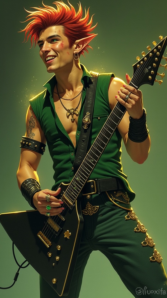 A character for Changeling: The Dreaming. Fairy tales in modern times. This character is is Clurichaun, very similar to a Leprechaun, a male faery-being. He is a talented Rock musician, he sings and plays electric guitar. Unbeknownst to most people, he infuses a little magic into his music. What people think are special effects is him using his abilities. He sparkles and shines on-stage, surrounded by glittering stars. His voice can charm angels. And if things get dangerous or uncomfortable, he can disappear in the blink of an eye! Masculine Caucasian young college-aged man of Irish/Celtic heritage. Medium height, thin but muscular, lithe, sinewy. Fair skinned, coppery red hair, emerald green eyes that slightly glow. Thin, handsome rugged face with red soulpatch and freckles across his nose and cheeks. Strong brow and jaw, faux-hawk hairstyle short on sides and back, longer and touseled on top. His ears are slightly pointed, as are most faery beings. He wears a small gold hoop in one of his ears. He grins and smiles easily. He is handsome and attractive. He wears a suede forest green vest with no shirt underneath. A gold necklace with a triskelle symbol on it, there is an emerald in the center.. Black leather bracers on his sinewy arms. He has a harp tattoo on his shoulder, signifying Ireland. Various gold rings on his long, slender fingers. Snug fitting dark green jeans embroidered with gold piping down the sides and pockets, a black leather studded belt around his waist. Black leather boots on his feet. He plays a guitar and smiles at the crowd, golden magic sparkling around him. Full body pose.