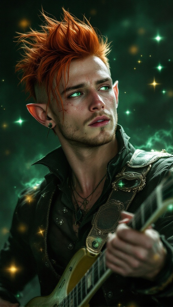 A character for Changeling: The Dreaming. Fairy tales in modern times. This character is is Clurichaun, very similar to a Leprechaun, a male faery-being. He is a talented Rock musician, he sings and plays electric guitar. Unbeknownst to most people, he infuses a little magic into his music. What people think are special effects is him using his abilities. He sparkles and shines on-stage, surrounded by glittering stars. His voice can charm angels. And if things get dangerous or uncomfortable, he can disappear in the blink of an eye! Masculine Caucasian young college-aged man of Irish/Celtic heritage. Medium height, thin but muscular, lithe, sinewy. Fair skinned, coppery red hair, emerald green eyes that slightly glow. Thin, handsome rugged face with red soulpatch and freckles across his nose and cheeks. Strong brow and jaw, faux-hawk hairstyle short on sides and back, longer and touseled on top. His ears are slightly pointed, as are most faery beings. He wears a small gold hoop in one of his ears. He grins and smiles easily. He is handsome and attractive. He wears a suede forest green vest with no shirt underneath. A gold necklace with a triskelle symbol on it, there is an emerald in the center.. Black leather bracers on his sinewy arms. He has a harp tattoo on his shoulder, signifying Ireland. Various gold rings on his long, slender fingers. Snug fitting dark green jeans embroidered with gold piping down the sides and pockets, a black leather studded belt around his waist. Black leather boots on his feet. He plays a guitar and smiles at the crowd, golden magic sparkling around him. Full body pose.