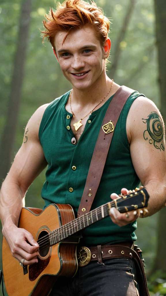 A character for Changeling: The Dreaming. Fairy tales in modern times. This character is is Clurichaun, very similar to a Leprechaun, a male faery-being. He is a talented Rock musician, he sings and plays electric guitar. Unbeknownst to most people, he infuses a little magic into his music. What people think are special effects is him using his abilities. He sparkles and shines on-stage, surrounded by glittering stars. His voice can charm angels. And if things get dangerous or uncomfortable, he can disappear in the blink of an eye! Masculine Caucasian young college-aged man of Irish/Celtic heritage. Medium height, thin but muscular, lithe, sinewy. Fair skinned, coppery red hair, emerald green eyes that slightly glow. Thin, handsome rugged face with red soulpatch and freckles across his nose and cheeks. Strong brow and jaw, faux-hawk hairstyle short on sides and back, longer and touseled on top. His ears are slightly pointed, as are most faery beings. He wears a small gold hoop in one of his ears. He grins and smiles easily. He is handsome and attractive. He wears a suede forest green vest with no shirt underneath. A gold necklace with a triskelle symbol on it, there is an emerald in the center.. Black leather bracers on his sinewy arms. He has a harp tattoo on his shoulder, signifying Ireland. Various gold rings on his long, slender fingers. Snug fitting dark green jeans embroidered with gold piping down the sides and pockets, a black leather studded belt around his waist. Black leather boots on his feet. He plays a guitar and smiles at the crowd, golden magic sparkling around him. Full body pose.