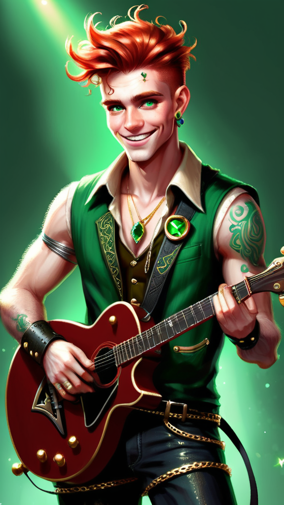 A character for Changeling: The Dreaming. Fairy tales in modern times. This character is is Clurichaun, very similar to a Leprechaun, a male faery-being. He is a talented Rock musician, he sings and plays electric guitar. Unbeknownst to most people, he infuses a little magic into his music. What people think are special effects is him using his abilities. He sparkles and shines on-stage, surrounded by glittering stars. His voice can charm angels. And if things get dangerous or uncomfortable, he can disappear in the blink of an eye! Masculine Caucasian young college-aged man of Irish/Celtic heritage. Medium height, thin but muscular, lithe, sinewy. Fair skinned, coppery red hair, emerald green eyes that slightly glow. Thin, handsome rugged face with red soulpatch and freckles across his nose and cheeks. Strong brow and jaw, faux-hawk hairstyle short on sides and back, longer and touseled on top. His ears are slightly pointed, as are most faery beings. He wears a small gold hoop in one of his ears. He grins and smiles easily. He is handsome and attractive. He wears a suede forest green vest with no shirt underneath. A gold necklace with a triskelle symbol on it, there is an emerald in the center.. Black leather bracers on his sinewy arms. He has a harp tattoo on his shoulder, signifying Ireland. Various gold rings on his long, slender fingers. Snug fitting dark green jeans embroidered with gold piping down the sides and pockets, a black leather studded belt around his waist. Black leather boots on his feet. He plays a guitar and smiles at the crowd, golden magic sparkling around him. Full body pose.