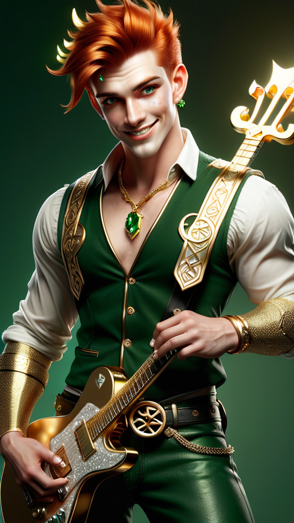 A character for Changeling: The Dreaming. Fairy tales in modern times. This character is is Clurichaun, very similar to a Leprechaun, a male faery-being. He is a talented Rock musician, he sings and plays electric guitar. Unbeknownst to most people, he infuses a little magic into his music. What people think are special effects is him using his abilities. He sparkles and shines on-stage, surrounded by glittering stars. His voice can charm angels. And if things get dangerous or uncomfortable, he can disappear in the blink of an eye! Masculine Caucasian young college-aged man of Irish/Celtic heritage. Medium height, thin but muscular, lithe, sinewy. Fair skinned, coppery red hair, emerald green eyes that slightly glow. Thin, handsome rugged face with red soulpatch and freckles across his nose and cheeks. Strong brow and jaw, faux-hawk hairstyle short on sides and back, longer and touseled on top. His ears are slightly pointed, as are most faery beings. He wears a small gold hoop in one of his ears. He grins and smiles easily. He is handsome and attractive. He wears a suede forest green vest with no shirt underneath. A gold necklace with a triskelle symbol on it, there is an emerald in the center.. Black leather bracers on his sinewy arms. He has a harp tattoo on his shoulder, signifying Ireland. Various gold rings on his long, slender fingers. Snug fitting dark green jeans embroidered with gold piping down the sides and pockets, a black leather studded belt around his waist. Black leather boots on his feet. He plays a guitar and smiles at the crowd, golden magic sparkling around him. Full body pose.