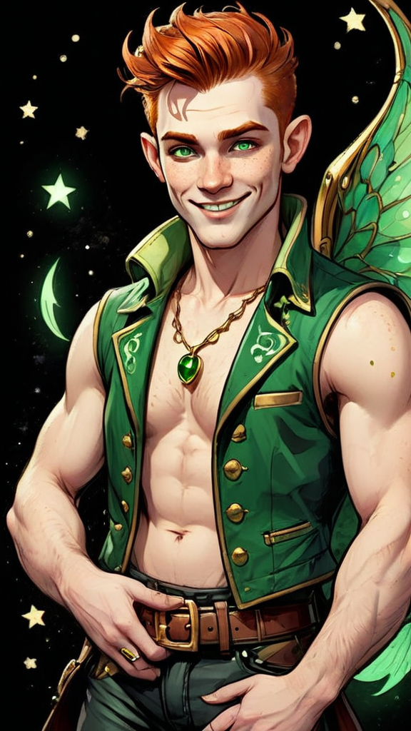A character for Changeling: The Dreaming. Fairy tales in modern times. This character is is Clurichaun, very similar to a Leprechaun, a male faery-being. He is a talented Rock musician, he sings and plays electric guitar. Unbeknownst to most people, he infuses a little magic into his music. What people think are special effects is him using his abilities. He sparkles and shines on-stage, surrounded by glittering stars. His voice can charm angels. And if things get dangerous or uncomfortable, he can disappear in the blink of an eye! Masculine Caucasian young college-aged man of Irish/Celtic heritage. Medium height, thin but muscular, lithe, sinewy. Fair skinned, coppery red hair, emerald green eyes that slightly glow. Thin, handsome rugged face with red soulpatch and freckles across his nose and cheeks. Strong brow and jaw, faux-hawk hairstyle short on sides and back, longer and touseled on top. His ears are slightly pointed, as are most faery beings. He wears a small gold hoop in one of his ears. He grins and smiles easily. He is handsome and attractive. He wears a suede forest green vest with no shirt underneath. A gold necklace with a triskelle symbol on it, there is an emerald in the center.. Black leather bracers on his sinewy arms. He has a harp tattoo on his shoulder, signifying Ireland. Various gold rings on his long, slender fingers. Snug fitting dark green jeans embroidered with gold piping down the sides and pockets, a black leather studded belt around his waist. Black leather boots on his feet. He plays a guitar and smiles at the crowd, golden magic sparkling around him. Full body pose.