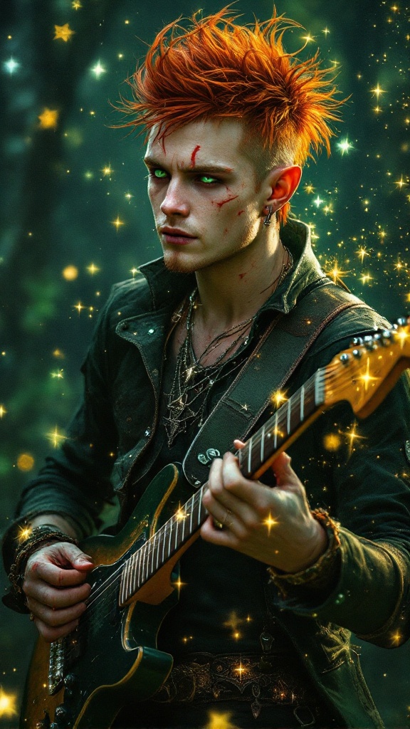 A character for Changeling: The Dreaming. Fairy tales in modern times. This character is is Clurichaun, very similar to a Leprechaun, a male faery-being. He is a talented Rock musician, he sings and plays electric guitar. Unbeknownst to most people, he infuses a little magic into his music. What people think are special effects is him using his abilities. He sparkles and shines on-stage, surrounded by glittering stars. His voice can charm angels. And if things get dangerous or uncomfortable, he can disappear in the blink of an eye! Masculine Caucasian young college-aged man of Irish/Celtic heritage. Medium height, thin but muscular, lithe, sinewy. Fair skinned, coppery red hair, emerald green eyes that slightly glow. Thin, handsome rugged face with red soulpatch and freckles across his nose and cheeks. Strong brow and jaw, faux-hawk hairstyle short on sides and back, longer and touseled on top. His ears are slightly pointed, as are most faery beings. He wears a small gold hoop in one of his ears. He grins and smiles easily. He is handsome and attractive. He wears a suede forest green vest with no shirt underneath. A gold necklace with a triskelle symbol on it, there is an emerald in the center.. Black leather bracers on his sinewy arms. He has a harp tattoo on his shoulder, signifying Ireland. Various gold rings on his long, slender fingers. Snug fitting dark green jeans embroidered with gold piping down the sides and pockets, a black leather studded belt around his waist. Black leather boots on his feet. He plays a guitar and smiles at the crowd, golden magic sparkling around him. Full body pose.