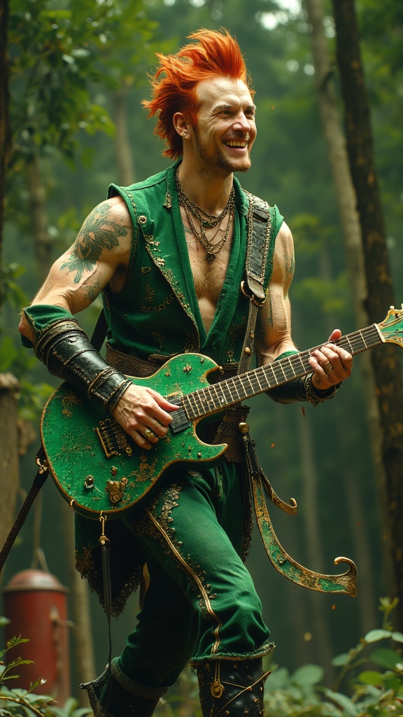 A character for Changeling: The Dreaming. Fairy tales in modern times. This character is is Clurichaun, very similar to a Leprechaun, a male faery-being. He is a talented Rock musician, he sings and plays electric guitar. Unbeknownst to most people, he infuses a little magic into his music. What people think are special effects is him using his abilities. He sparkles and shines on-stage, surrounded by glittering stars. His voice can charm angels. And if things get dangerous or uncomfortable, he can disappear in the blink of an eye! Masculine Caucasian young college-aged man of Irish/Celtic heritage. Medium height, thin but muscular, lithe, sinewy. Fair skinned, coppery red hair, emerald green eyes that slightly glow. Thin, handsome rugged face with red soulpatch and freckles across his nose and cheeks. Strong brow and jaw, faux-hawk hairstyle short on sides and back, longer and touseled on top. His ears are slightly pointed, as are most faery beings. He wears a small gold hoop in one of his ears. He grins and smiles easily. He is handsome and attractive. He wears a suede forest green vest with no shirt underneath. A gold necklace with a triskelle symbol on it, there is an emerald in the center.. Black leather bracers on his sinewy arms. He has a harp tattoo on his shoulder, signifying Ireland. Various gold rings on his long, slender fingers. Snug fitting dark green jeans embroidered with gold piping down the sides and pockets, a black leather studded belt around his waist. Black leather boots on his feet. He plays a guitar and smiles at the crowd, golden magic sparkling around him. Full body pose.