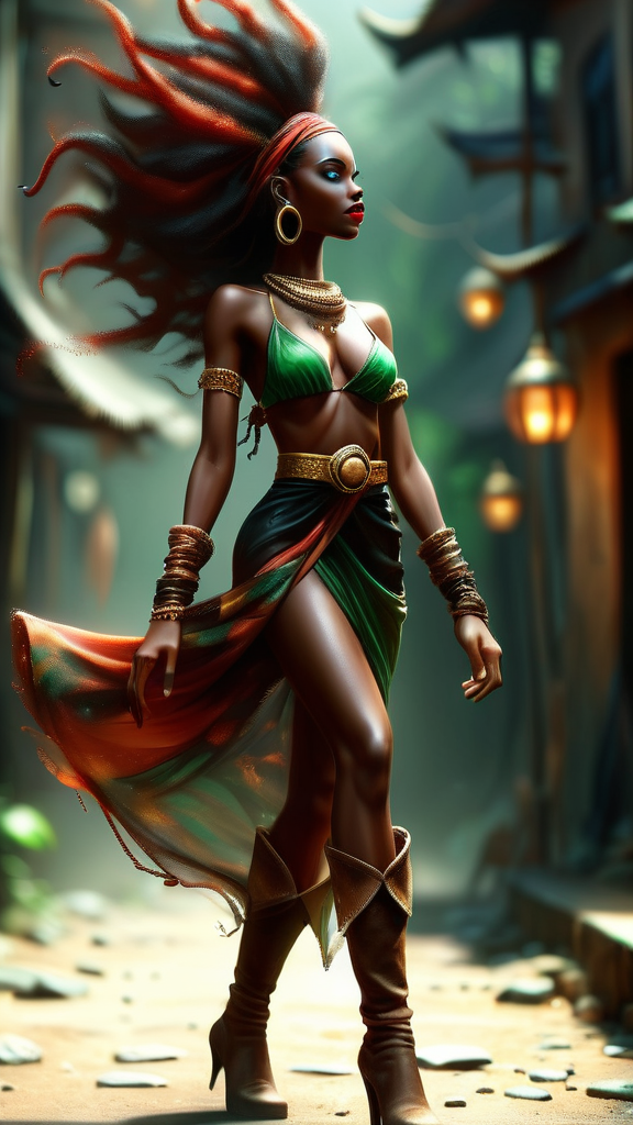 A character for Changeling: The Dreaming, fairytales in modern day times. She is an Eshu, an African faery being. Feminine female wanderer, storyteller, modern vagabond. She has the ability to walk between worlds. If there is a path or trod that will lead to a magical place, she will find it. When she tells a story of faraway places, you can practically see and hear what she describes, no one tells a story like she does. Her dark eyes are starlit, you can almost see the beginning of time in them. Tall, slender, lithe but strong and athletic, a dancer's build. Of African descent, her skin is dark brown and smooth. Medium length black hair, curlly and coiled, in an asymmetrical style, braided on one side and falling loosely to the other side of her head. Beautiful face, high cheekbones and full lips, a model's face. Dark eyes that sparkle with starlight, moderate make-up on eyes with dark red lips. Gold dagger-shaped earrings in her slightly pointed ears and gold bangle bracelets on her arms, as well as a necklace with an emerald around her neck. She wears a beautiful layered silk minidress in African colors of red, black and green with a golden metallic belt around her waist. A long flowing red silk scarf tied around her neck, and red soft suede knee-high boots with medium heels on her feet. When she walks, she leaves a trail of golden glitter in her wake, it comes from her shining golden aura. Wherever she goes, adventure awaits. Full body pose, walking towards some unkown path in the city...