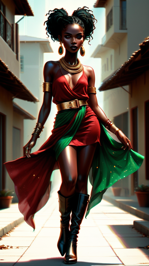 A character for Changeling: The Dreaming, fairytales in modern day times. She is an Eshu, an African faery being. Feminine female wanderer, storyteller, modern vagabond. She has the ability to walk between worlds. If there is a path or trod that will lead to a magical place, she will find it. When she tells a story of faraway places, you can practically see and hear what she describes, no one tells a story like she does. Her dark eyes are starlit, you can almost see the beginning of time in them. Tall, slender, lithe but strong and athletic, a dancer's build. Of African descent, her skin is dark brown and smooth. Medium length black hair, curlly and coiled, in an asymmetrical style, braided on one side and falling loosely to the other side of her head. Beautiful face, high cheekbones and full lips, a model's face. Dark eyes that sparkle with starlight, moderate make-up on eyes with dark red lips. Gold dagger-shaped earrings in her slightly pointed ears and gold bangle bracelets on her arms, as well as a necklace with an emerald around her neck. She wears a beautiful layered silk minidress in African colors of red, black and green with a golden metallic belt around her waist. A long flowing red silk scarf tied around her neck, and red soft suede knee-high boots with medium heels on her feet. When she walks, she leaves a trail of golden glitter in her wake, it comes from her shining golden aura. Wherever she goes, adventure awaits. Full body pose, walking towards some unkown path in the city...