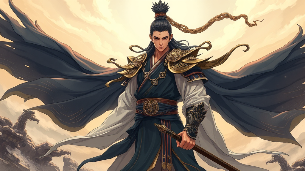 A character in the style of anime-inspired design reminiscent of Kung Pow, blending elements of Bernardo Strozzi's classic touch with the grandeur of scale, adorned in light navy and dark bronze. Infused with zen-inspired calmness, the character exudes an aura of stillness and power. Crafted with meticulous realistic details, the visual nods to the illustrative techniques of Ron Embleton. Flowing robes are contrasted with intricate armor pieces, with serene expressions and fluid movements creating a harmonious balance between strength and tranquility. The character stands against a vast landscape, amplifying their commanding presence.
