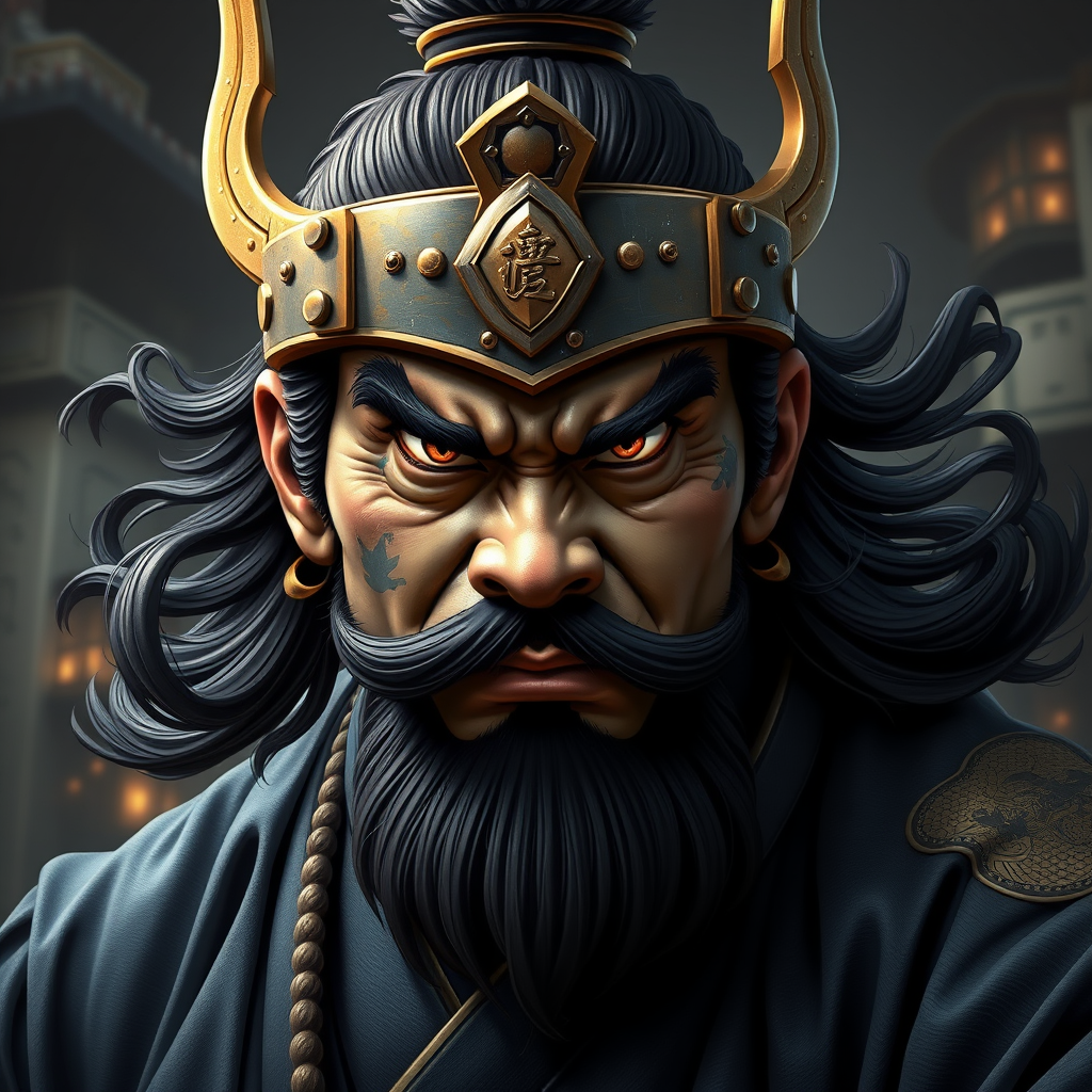A character inspired by Kung Pow in anime-influenced design style, capturing the essence of Bernardo Strozzi's grandeur with an expansive sense of scale, embodied in a palette of light navy and dark bronze. Infused with zen-inspired calmness, reminiscent of Ron Embleton's detailed realism, this character exudes an aura of mastery and focus, featuring intricately realistic details that bring the concept to life, maintaining the core essence with small creative modifications integrated into the design.