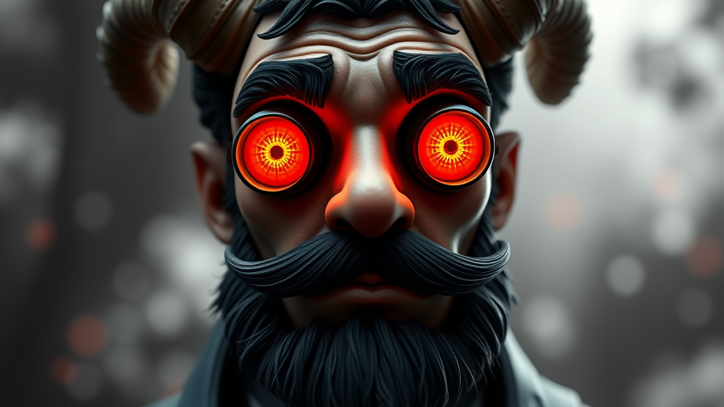 A character portrait of a man with horns and a beard, designed by a senior character artist and polycount contest winner, rendered in Unreal Engine 5. The character features bright, neon Pixar-style eyes that are large and circular. The portrayal gives a whimsical, cartoonish vibe, echoing a playful interaction reminiscent of Nomeradona's playground. The image is intricately detailed yet abstract, with a touch of disfigurement and deformation for added quirkiness. It's a 3D animated figure with elements that resemble a toy, featuring exaggerated anatomy like extra limbs and an unusual anatomy. The close-up has a slightly blurry, black-and-white background with bursts of weird colors, creating a surreal atmosphere. The piece includes subtle, artistic imperfections such as distortions in facial features and anatomy, evoking a sense of mischief and charm. There is a playful use of oversaturation and blur to mimic a CGI 3D effect, complete with underlying artistic 'flaws' that make the composition endearing and memorable.
