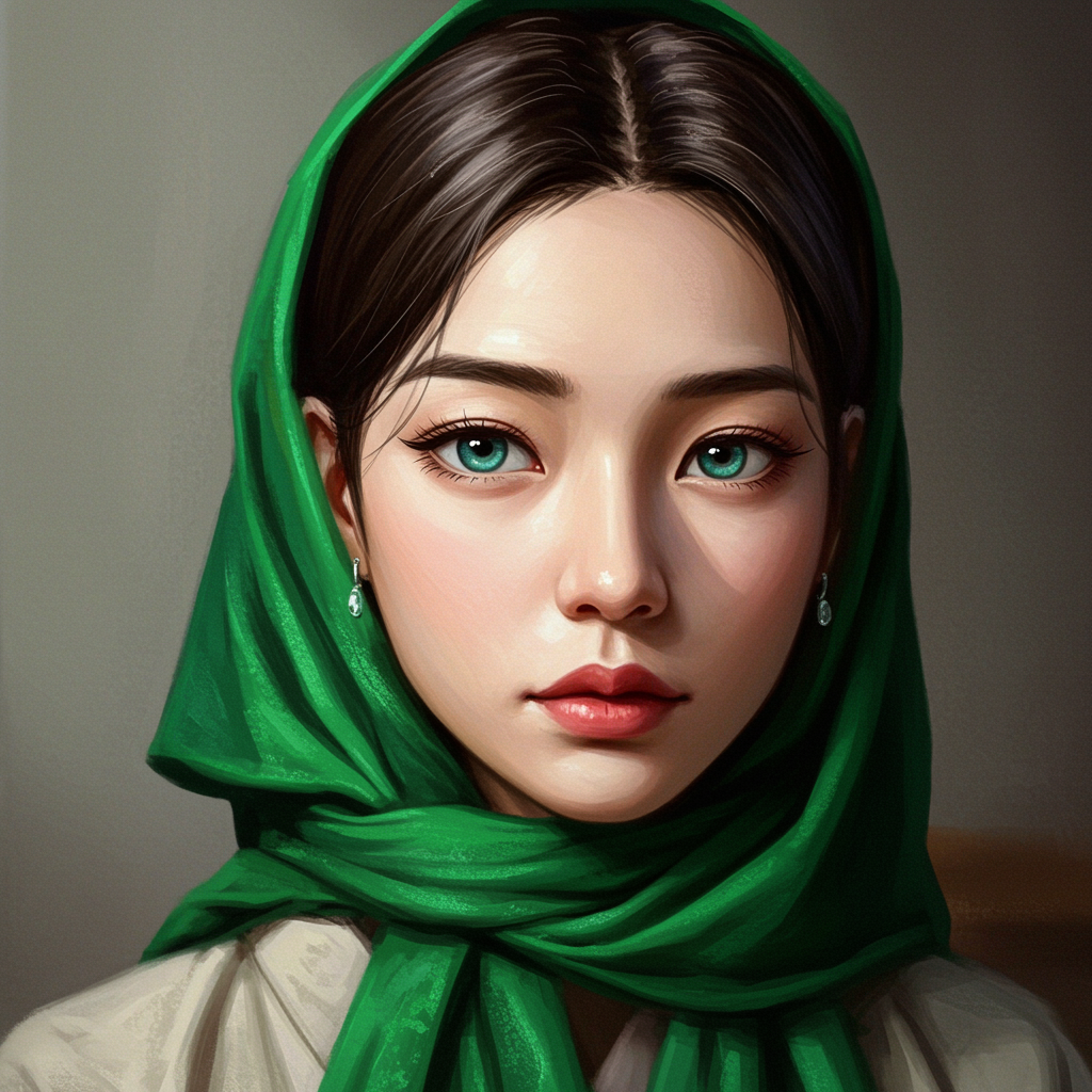 A character portrait of a woman adorned with a vibrant emerald scarf elegantly wrapped around her neck, painted with the intricate detail and depth reminiscent of Sim Sa-jeong's traditional artistry. This photorealistic image blends the captivating style of Ilya Kuvshinov, featuring luminous, expressive eyes and a serene countenance. Set in high-definition, the painting showcases the play of light and shadow across her delicate features, with subtle hues and textures that evoke a sense of timeless beauty, as if crafted by a master artist and displayed in an art gallery collection.