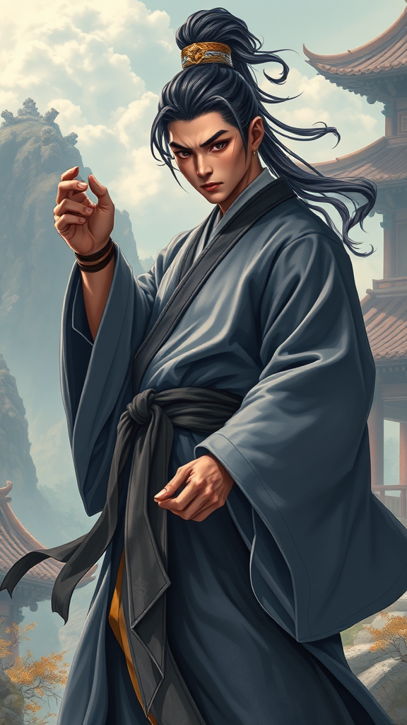 A character reminiscent of Kung Pow in anime-inspired design, blending the artistic style of Bernardo Strozzi with grand scale and intricate details. The character wears light navy and dark bronze attire, exuding a zen-inspired essence. The scene captures the realism and detail of Ron Embleton's work, featuring a dynamic pose and an intense focus. The background is a vast, serene landscape, with hints of traditional Asian architecture and nature elements that enhance the character's tranquil yet powerful presence, harmonizing the grandeur and elegance of their design.