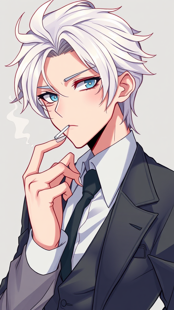 A character with striking white hair is depicted smoking with a sense of mystery. His eyes are sharp yet convey a gentle demeanor. He is dressed in a stylish suit that complements his elegant posture. The illustration draws inspiration from digital artists like Yanjun Cheng, Beeple, Rhads, and Lois van Baarle, showcasing a cartoon-like style with bright pastel colors. The image blends these elements to create a retro anime-inspired character, featuring subtle creative enhancements to give the artwork a unique and enchanting appeal.