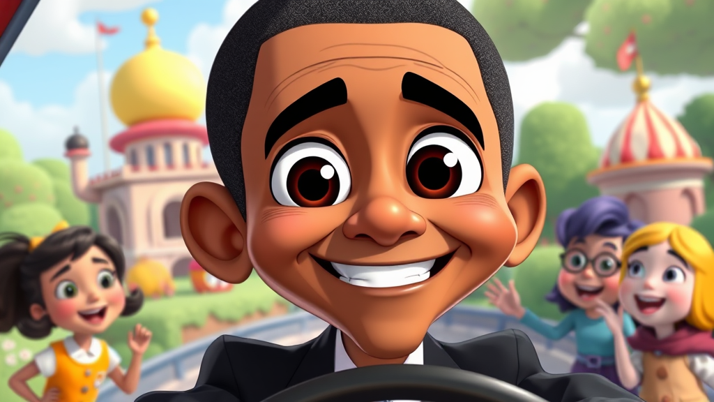 A charismatic and friendly animated leader with big expressive eyes, a warm smile, and a distinctive voice, reminiscent of President Obama, navigating a whimsical world filled with vibrant colors, quirky characters, and important life lessons, embodying optimism and diplomacy in every interaction.