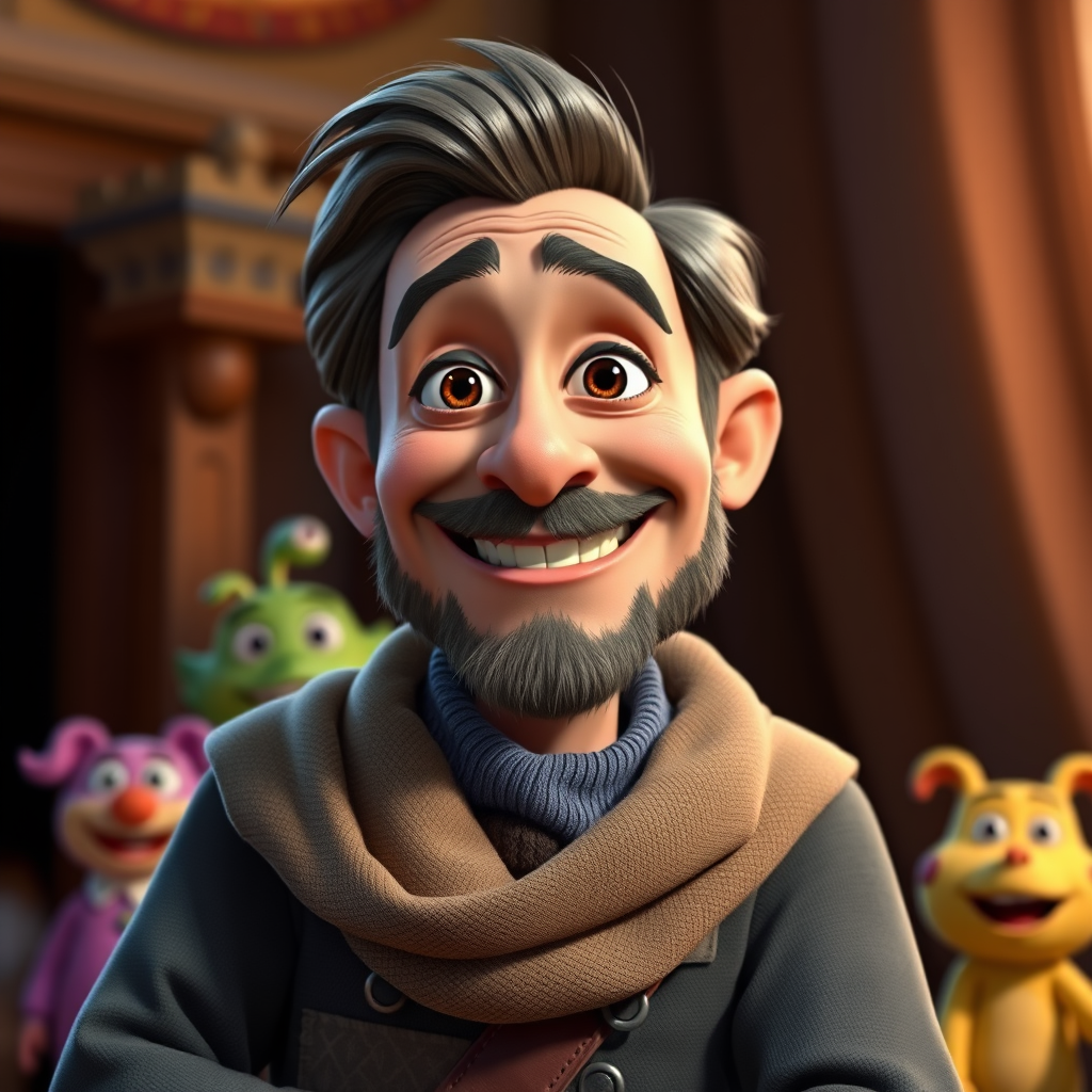 A charismatic and thoughtful leader with an infectious smile, embodying the wisdom and charm of a Pixar character, complete with animated expressions and a warm, approachable demeanor, navigating a vibrant world filled with quirky sidekicks and unexpected adventures.