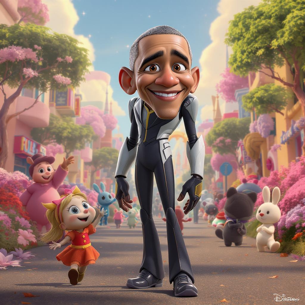 A charismatic, animated character inspired by President Obama with kind eyes and a warm smile, wearing a sleek futuristic suit and exuding a sense of leadership and optimism; his tall, slender frame is accentuated by graceful gestures and an approachable demeanor, embodying a character who guides others in a vibrant Pixar-style world filled with colorful backdrops and endearing companions.