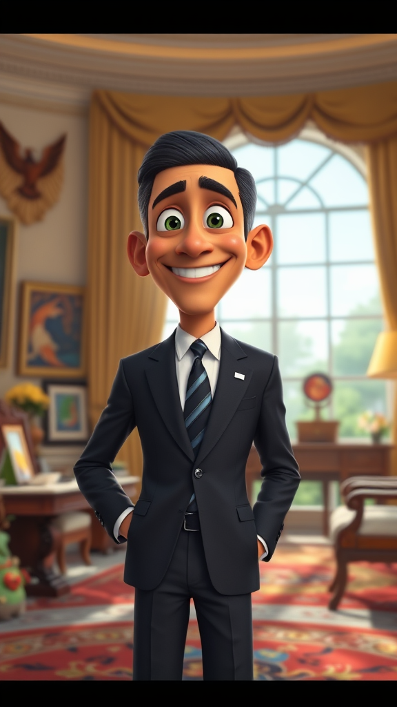 A charismatic, animated leader with a warm smile and confident demeanor, resembling an inspiring Pixar character dressed in a sharp, modern suit, standing in a sunlit oval office filled with colorful art and symbols of hope, conveying a sense of optimism and change through his expressive eyes and lively gestures.