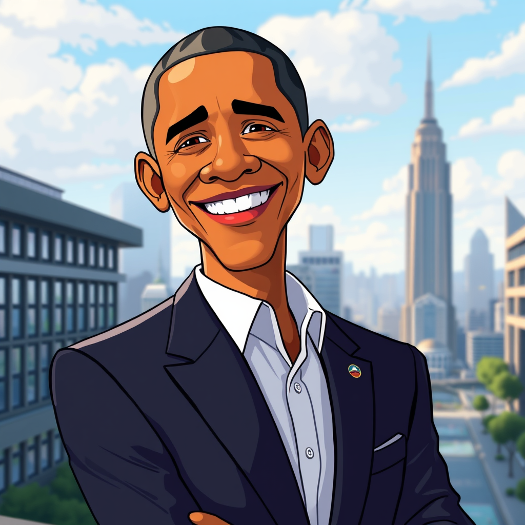 A charismatic animated leader with Obama’s signature warm smile and confident demeanor, dressed in a sleek, modern suit with a hint of vibrant color, exuding charm and wisdom, set against a backdrop of a stylized, futuristic city that embodies hope and progress.