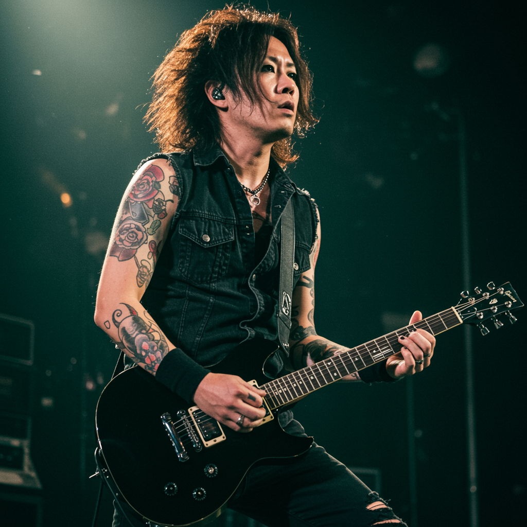 A charismatic male Japanese rockstar commands the stage, wielding an electric guitar with sleek precision. His long, stylishly untamed hair cascades like a rock 'n' roll aura, while intricate tattoos trace along his arms, telling stories of rebellion and artistry. The atmospheric, cinematic lighting bathes the scene in a soft, diffused glow, casting real, dynamic shadows that enhance his commanding presence. The photography captures every detail with breathtaking clarity, paying homage to the hyperrealism of his striking features and detailed skin. The image, rendered in sharp focus with a shallow depth of field, draws the viewer's eye to his intense expression, while the out-of-frame elements suggest a world beyond the lens. Elements of cinematic noise add authenticity and texture, complementing the rockstar's raw energy. Subtle creative modifications enhance the narrative, while maintaining the integrity of the original vision, celebrating the artistry and spirit of a musical icon on stage.