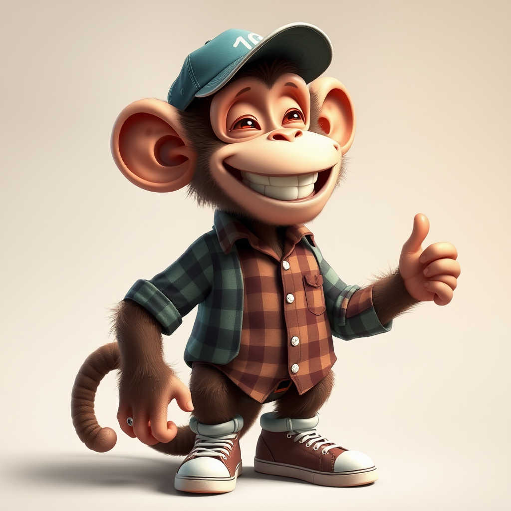A charismatic monkey character with the ability to assume a human form, exuding a sense of joy and wisdom. He's on the brink of fatherhood, embracing the exciting transition with humor and grace. His human guise adopts an endearing 'dad' aesthetic, complete with comfy plaid shirts, practical sneakers, and a trusty baseball cap. Though he exudes a playful energy, there's an unmistakable sense of maturity and readiness about him as he prepares for his new role as a father.