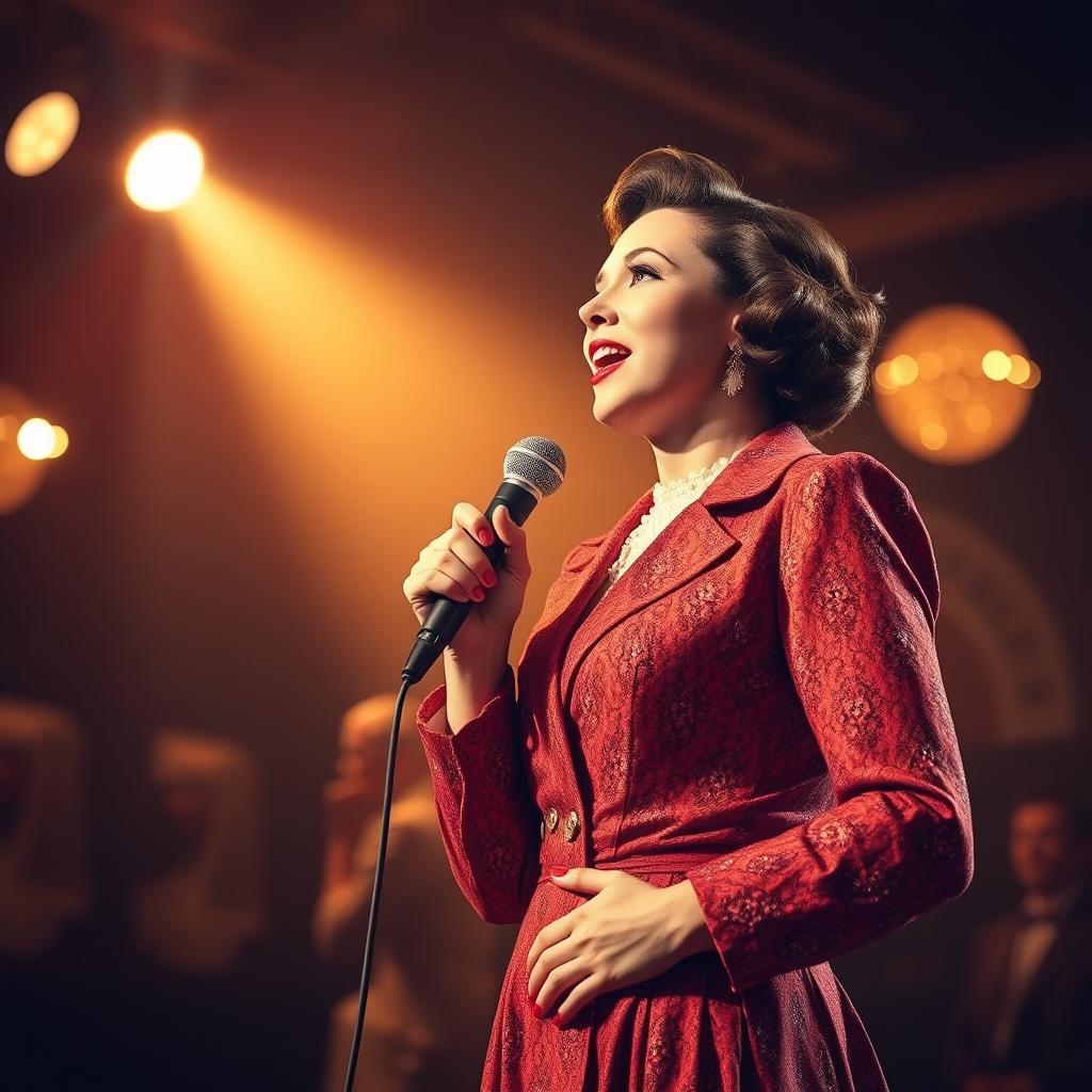 A charismatic singer from the 1940s, attired in an exquisite vintage ensemble reminiscent of the golden jazz era, captivating the audience with a soulful performance under the warm glow of stage lights.