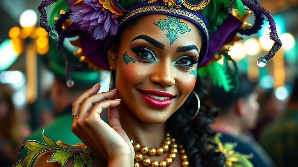 A charismatic woman at Mardi Gras, adorned in vibrant and expressive colors, exuding beauty and charm as she playfully engages the viewer. The portrait captures her in stunning detail, showcasing realistic skin textures and exquisite features. The scene is an 8k photorealistic depiction with meticulous attention to detail, presented in a full-length format. Soft, diffused lighting and a shallow depth of field enhance the image's cinematic quality, while maintaining a sharp focus. The atmosphere is one of hyperrealism and elegant allure, free of any distortions or imperfections, celebrating the festival's lively spirit.