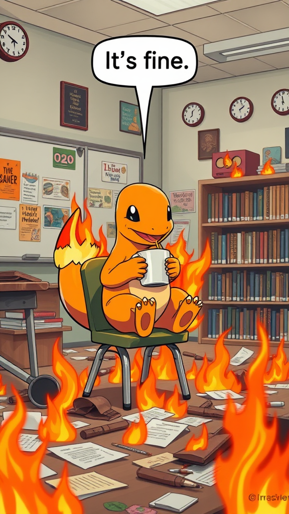A charmander perched on a miniature chair, literally amidst a blazing inferno, seems to be enjoying a perfectly ordinary morning in a charming classroom filled with the scattered remnants of a lesson plan. The walls are plastered with motivational posters, clocks ticking away on the whiteboard, and rows of neatly labeled bookshelves in various stages of disarray due to the spreading fire. The charmander sips from a cup, almost overflowing with steaming hot drink, his smile a perfect mask of nonchalance as he sits among the flames that seem to dance around him without causing him a single drop of concern. His flame had engulfed a corner of the room, where the desk was abandoned and papers strewn about, suggesting it had started there. None of the arson evidence seems to have deterred the charmander's nonchalant demeanor. The bubble floating above his head reads, "It's fine," in Comic Sans, almost as if he is embracing the chaos he has caused.