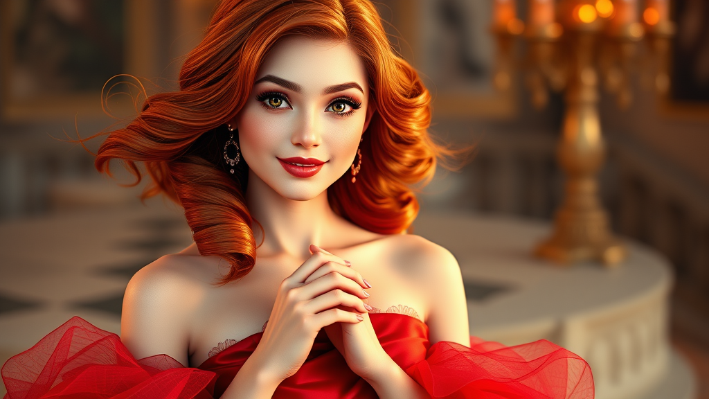 A charming 16-year-old sophisticated young woman with flowing fiery-red wavy hair, a soft, rounded face, and pronounced high cheekbones. Her elegantly arched eyebrows complement an enchanting smile, exuding refinement. Dressed in a stunning crimson ball gown, her hands are gracefully clasped together, epitomizing class and elegance. Captured in a 3D C4D, 8K rendering with an OC renderer, this image is of the highest quality, featuring cinematic lighting that highlights contrasts and intricate details. Presented with an artful, award-winning touch, this UHD 3D creation captures the essence of a beloved IP character, depicted in a blind box style with expressive and scenic elements, maintaining an artistic flair with a scene full of depth and vibrancy, enhanced by a soft, mystical aura around her.
